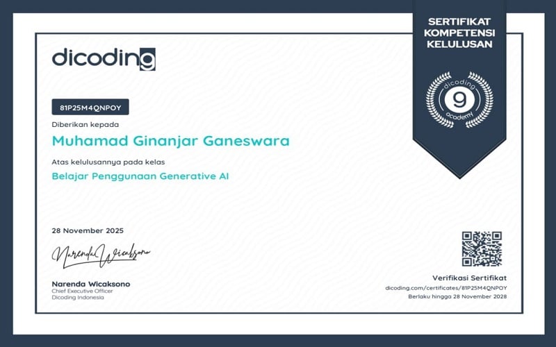 FKIP Universitas Pakuan - Muhamad Ginanjar Ganeswara, M.Pd., dosen Program Studi Pendidikan Bahasa dan Sastra Indonesia (PBSI) FKIP Universitas Pakuan, menunjukkan komitmen kuat terhadap pengembangan kompetensi digital dengan berhasil menyelesaikan dua sertifikasi prestisius dari Dicoding Indonesia. Sertifikasi tersebut bertajuk AI Praktis untuk Produktivitas dan Belajar Penggunaan Generative AI, keduanya merupakan pelatihan intensif yang dirancang untuk membantu tenaga pendidik dan profesional memaksimalkan kecerdasan buatan sebagai alat kerja strategis di era transformasi digital.