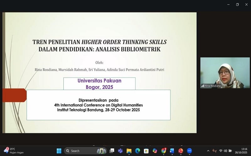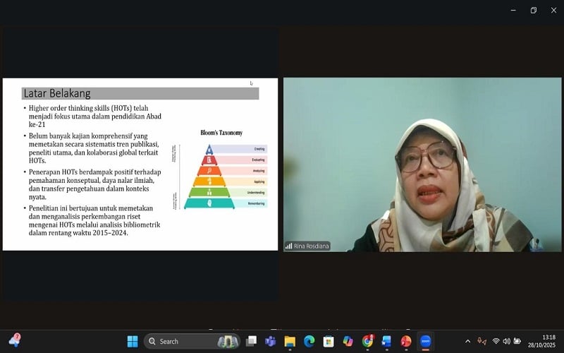 Sementara itu, Rina Rosdiana, M.Pd., memaparkan penelitian berjudul “Research Trends on Higher Order Thinking Skills in Education.” Dalam paparannya, beliau menyoroti arah penelitian keterampilan berpikir tingkat tinggi (HOTS) di dunia pendidikan serta tantangan dan peluang penerapannya di era digital.