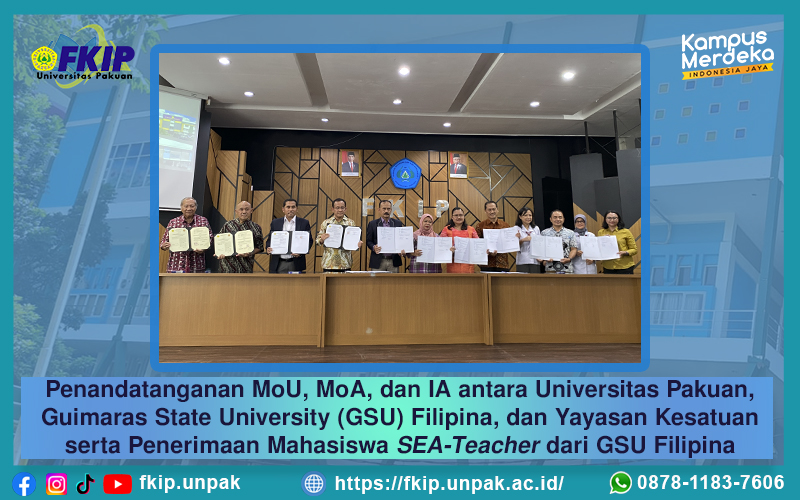 FKIP - Fakultas Keguruan dan Ilmu Pendidikan Universitas Pakuan secara resmi menandatangani Memorandum of Understanding (MoU) dan Memorandum of Agreement (MoA) dengan Guimaras State University (GSU) Filipina dan Yayasan Kesatuan. Penandatanganan ini bertujuan memperkuat kerja sama di bidang pendidikan, penelitian, serta pengembangan sumber daya manusia antara kedua institusi pendidikan tinggi dan Yayasan Kesatuan.
