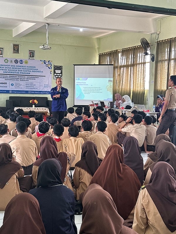 FKIP Universitas Pakuan - Pengabdian Kepada Masyarakat yang diselenggarakan oleh Program Studi Pendidikan Bahasa dan Sastra Indonesia Universitas Pakuan. PKM ini memiliki Tema “Literasi dan Retorika Kritis Siswa di Era Digital. Kegiatan PKM ini dilaksanakan pada 25 September 2025 berlokasi SMA Generus Mandiri. Tema pada kegiatan PKM tersebut memiliki arti bahwa siswa dalam proses pembelajaran di kelas dituntut untuk bisa aktif dan mampu berpikir kritis, dimana era digital ini abad ke 20 siswa akan berperan aktif dalam proses pembelajaran, maka dari itu siswa diharuskan memiliki minat literasi yang tinggi. Selain itu, siswa juga harus pandai dalam berkomunikasi baik di dalam kelas maupun di luar kelas. Maka materi retorika kritis di era digital ini sangat cocok untuk diberikan kepada siswa-siswi SMA Generus di era Digital. Siswa tidak hanya pandai berbicara secara langsung, melainkan juga pandai melalui media elektronik atau digital.