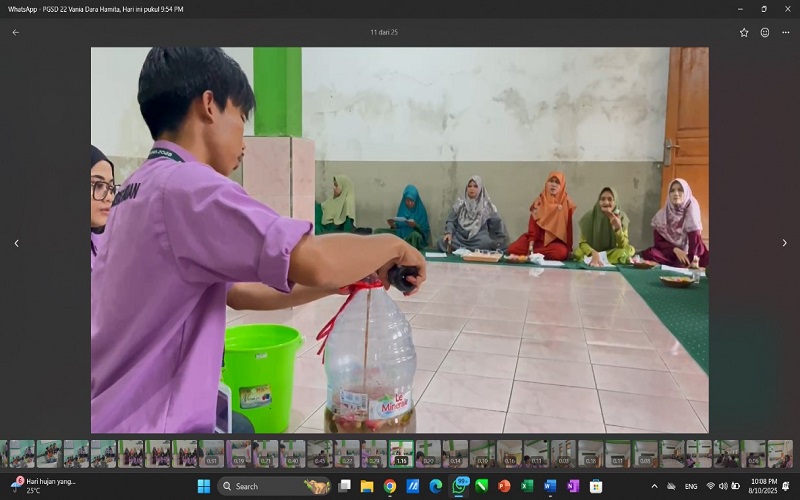 FKIP Universitas Pakuan - Kelompok mahasiswa Kuliah Kerja Nyata (KKN) Tematik asal Universitas Pakuan, Bogor mengadakan kegiatan sosialisasi mengenai pemanfaatan sampah organik untuk membuat ecoenzim. Acara ini berlangsung pada Rabu, 6 Agustus 2025, pukul 13.00 hingga 15.00 WIB, bertempat di Madrasah Nurul Amal.